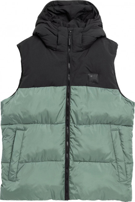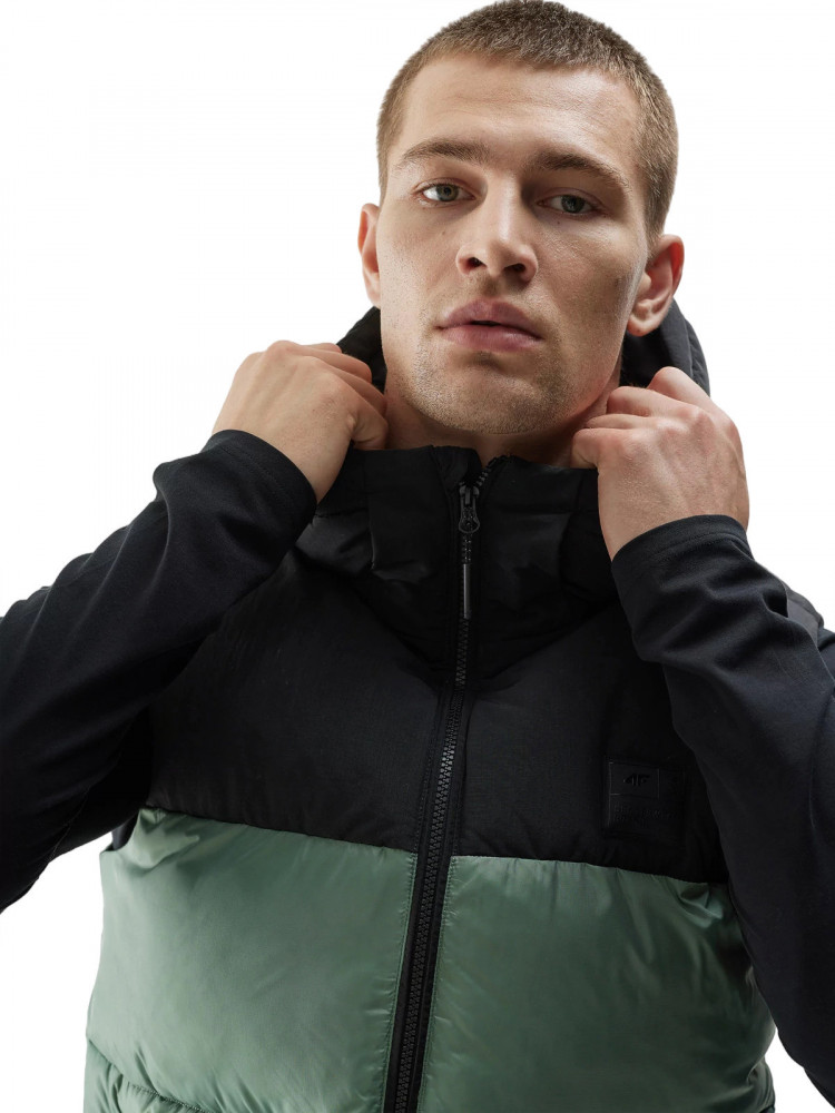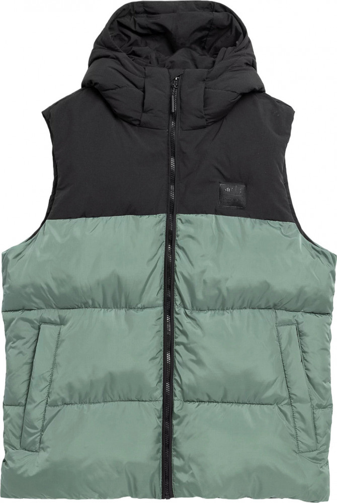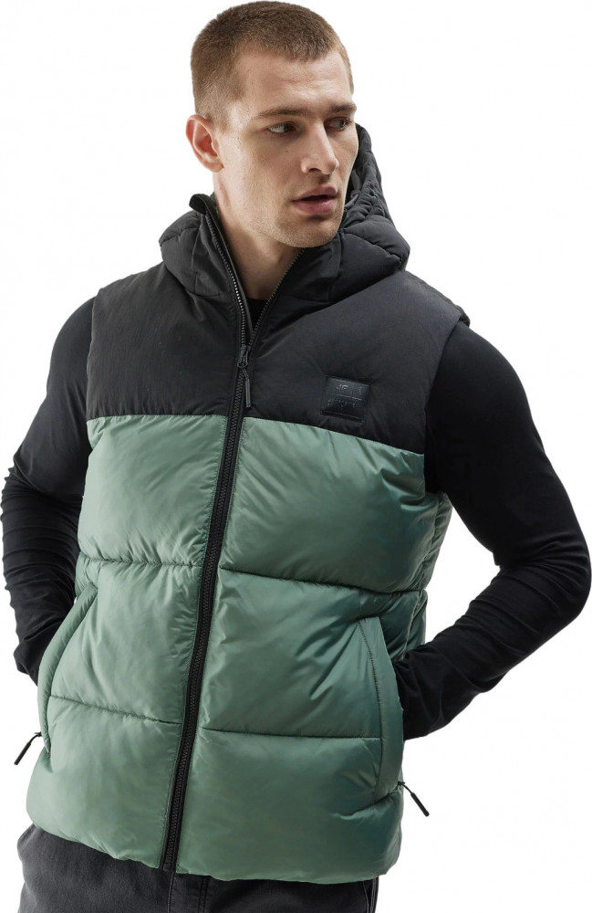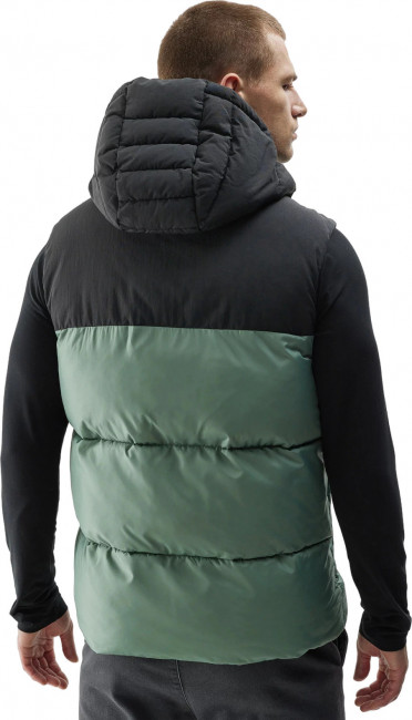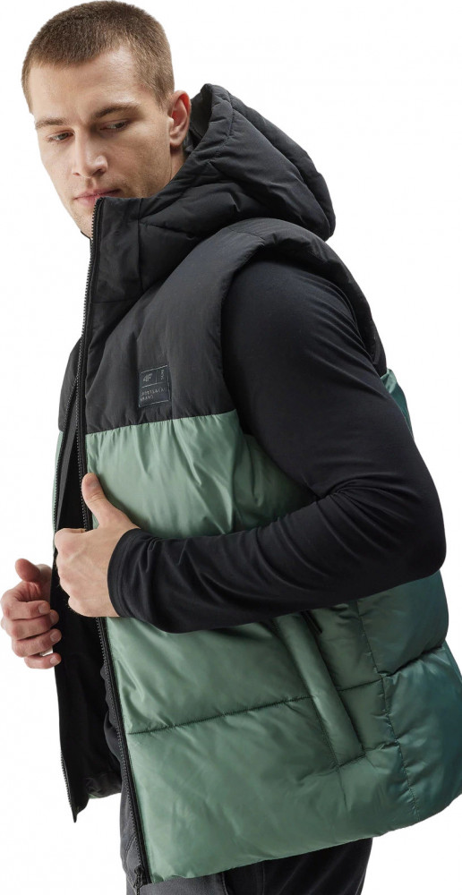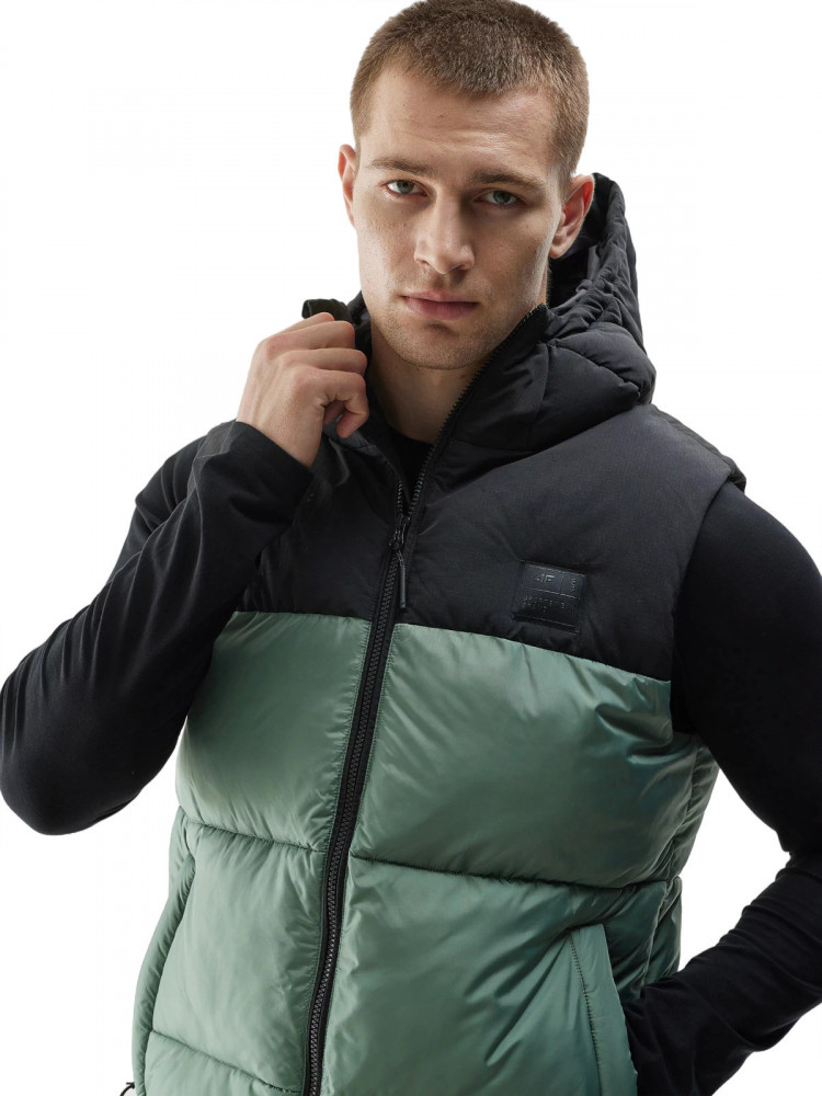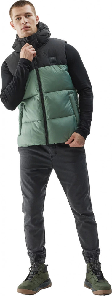 Жилет также имеет удобный капюшон с высоким воротником-стойкой для защиты от ветра и карманы для мелочей.